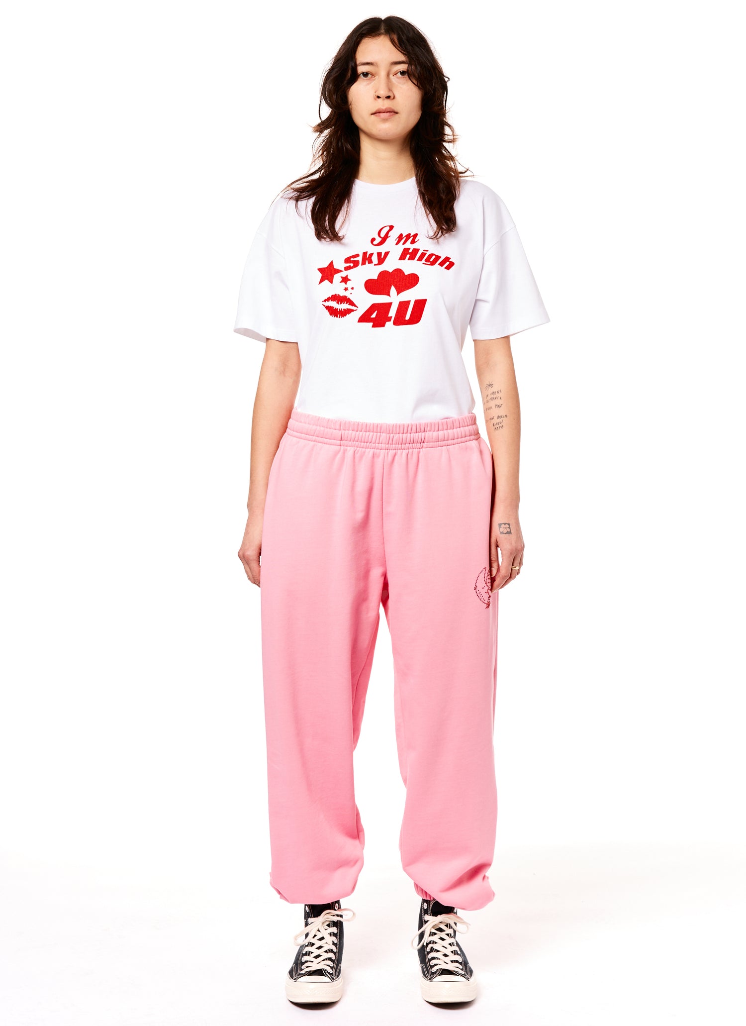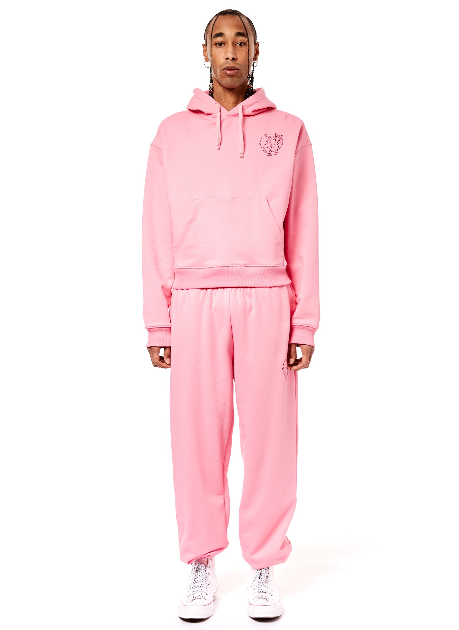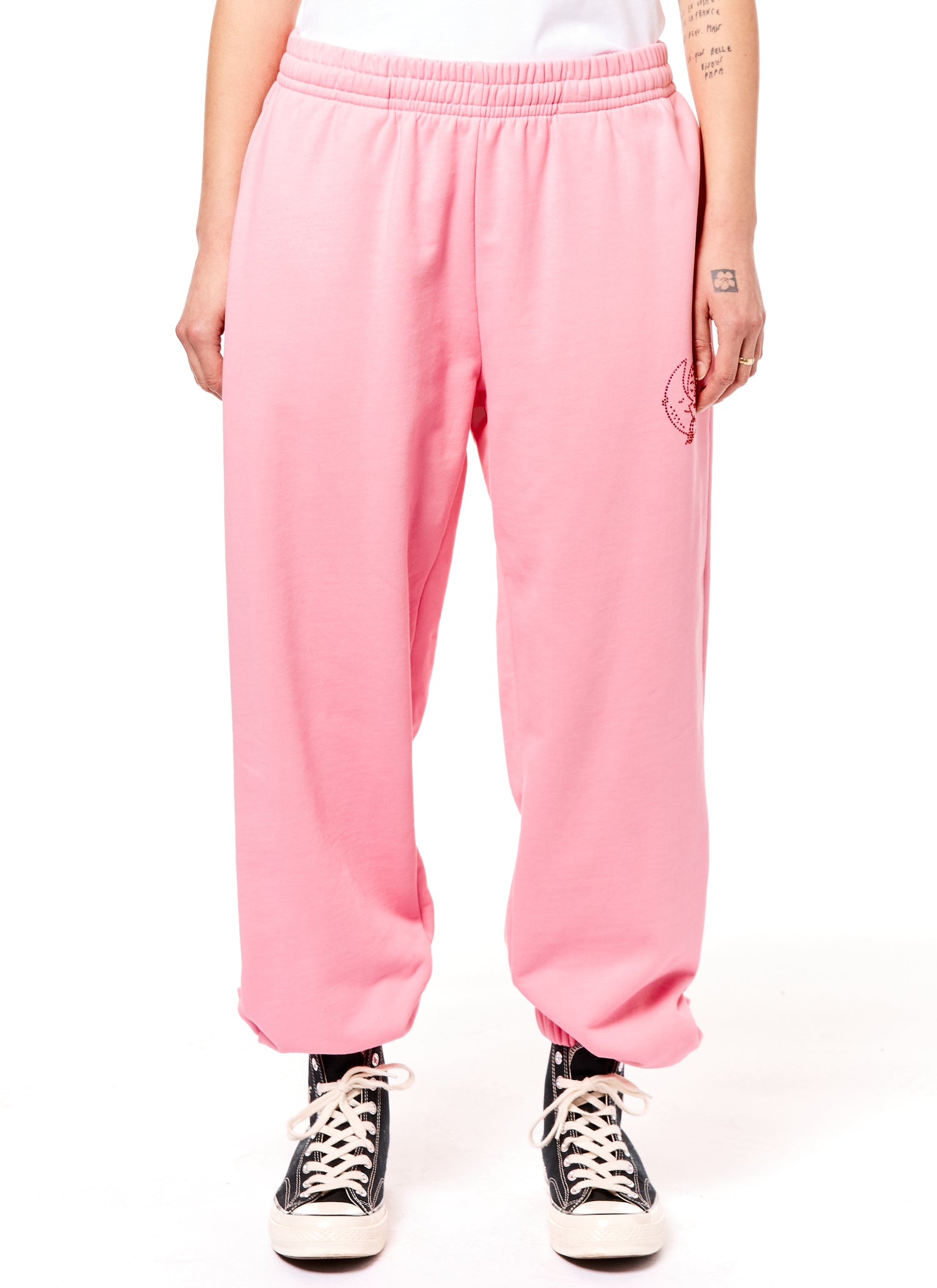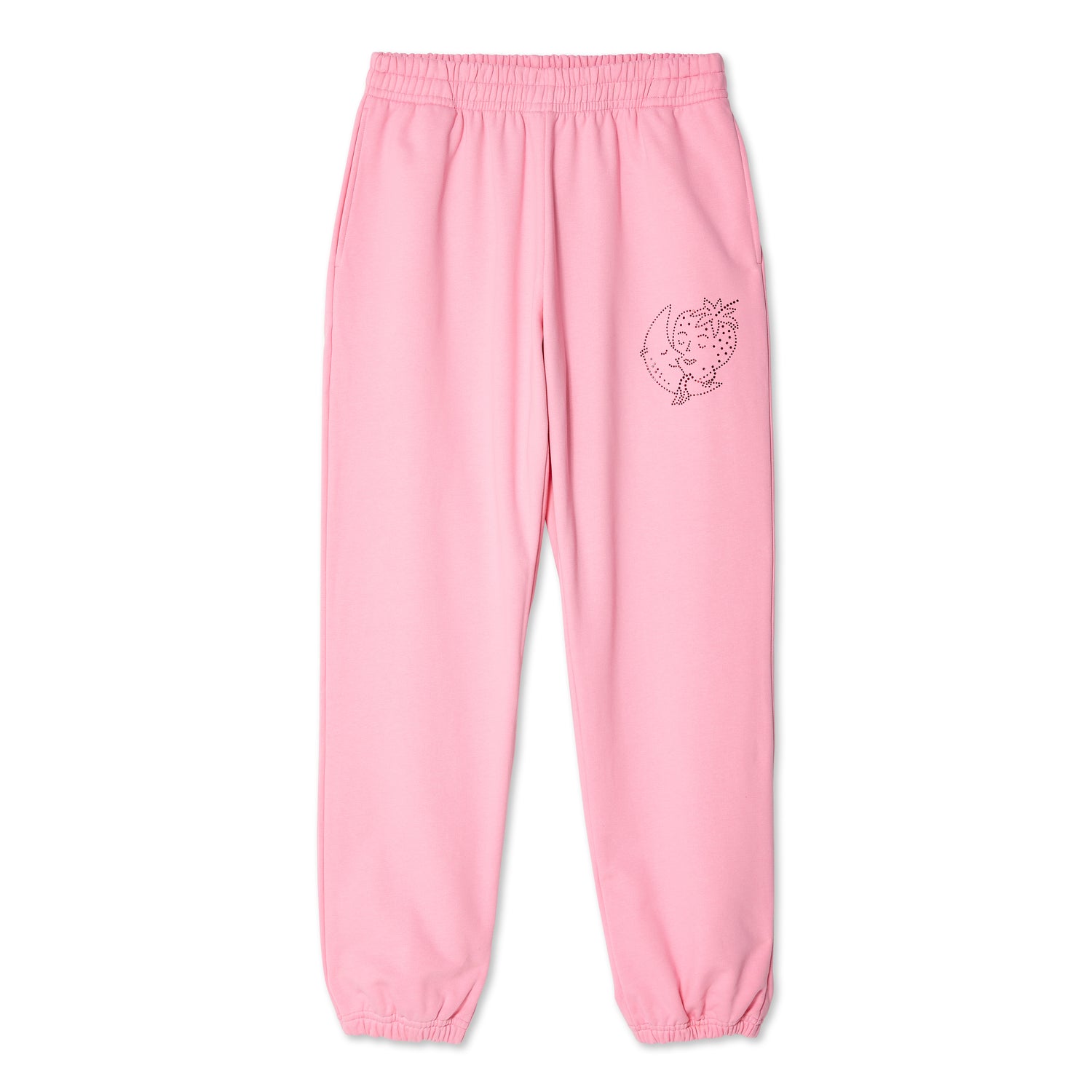 Classic organic cotton sweats featuring our Strawberry + Moon bedazzled on the lower left hip.