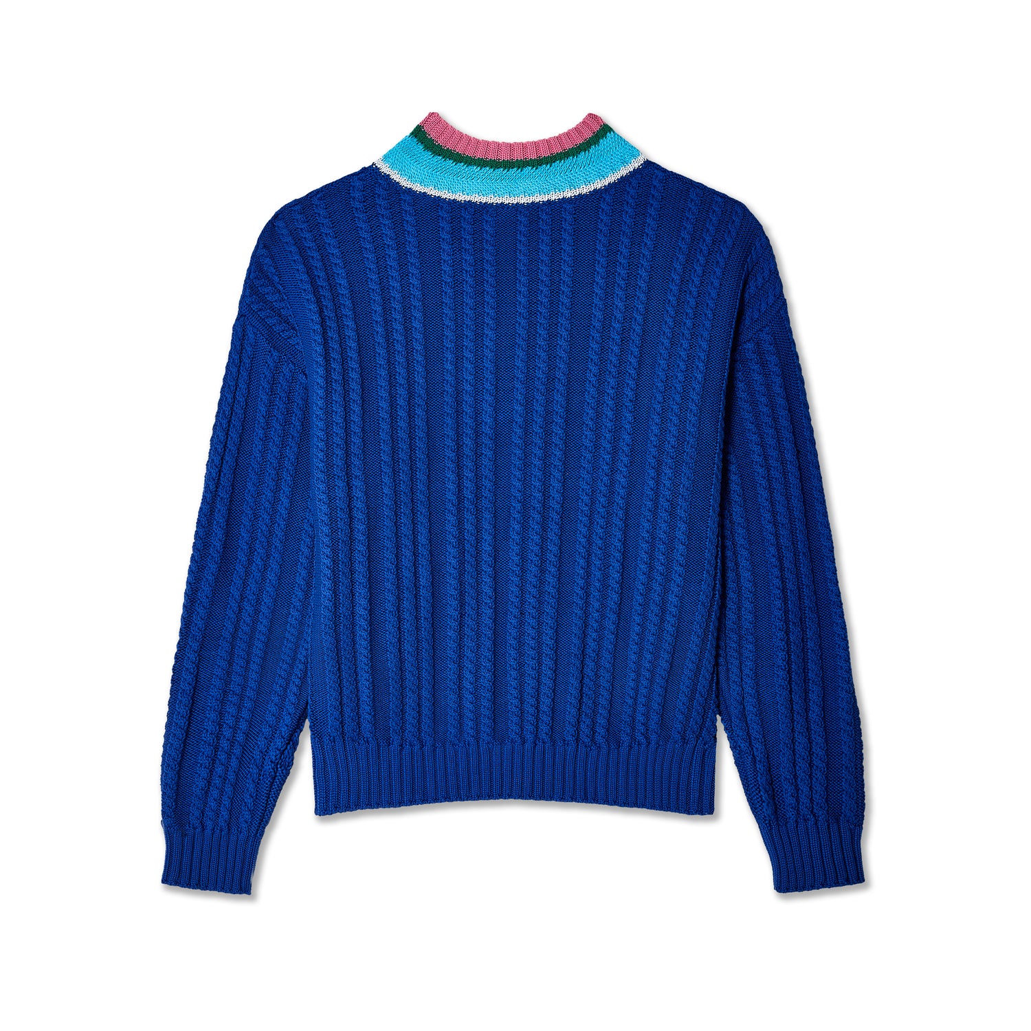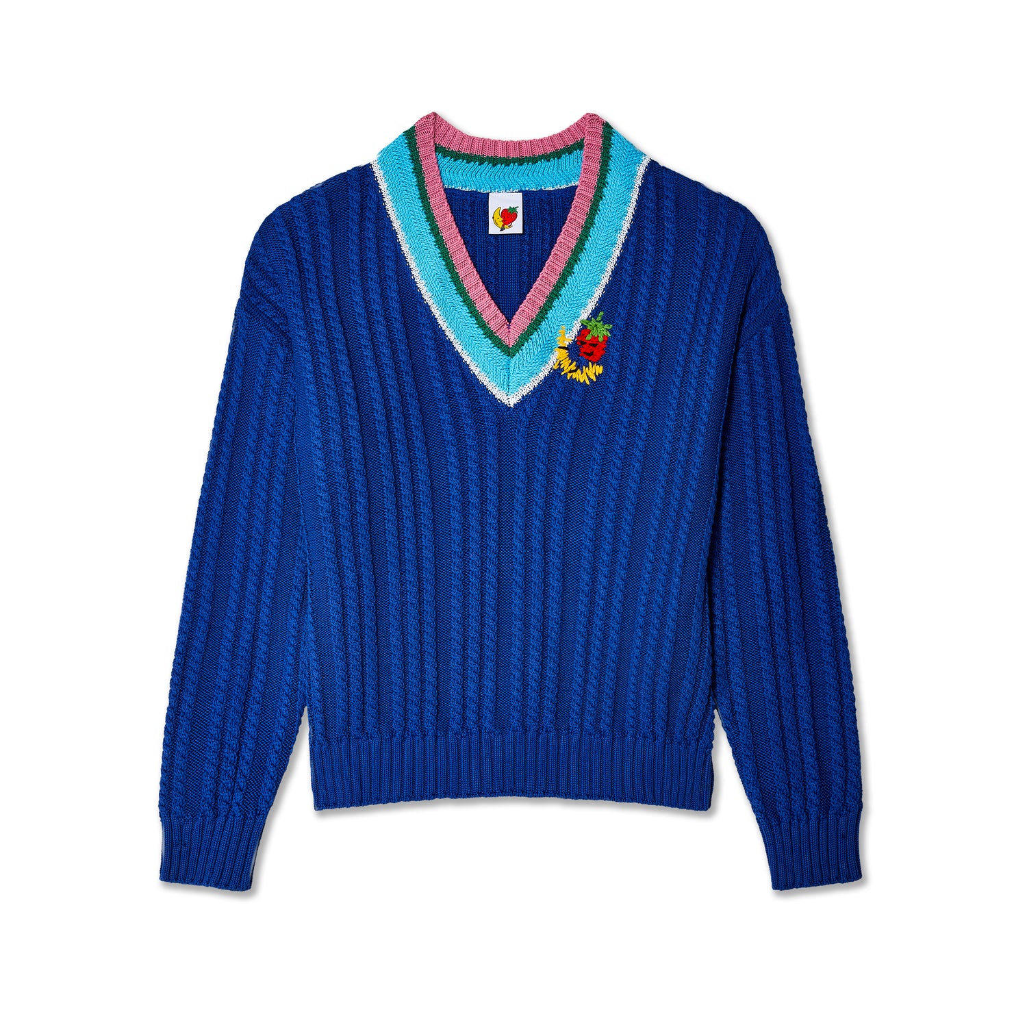 Made in Italy, our cable knit sweater has a boxy fit intended to fall just below the hip. Featuring a v-neck with glow-in-the-dark pastel colored stripes and a knitted abstract take on our classic Strawberry + Moon logo.