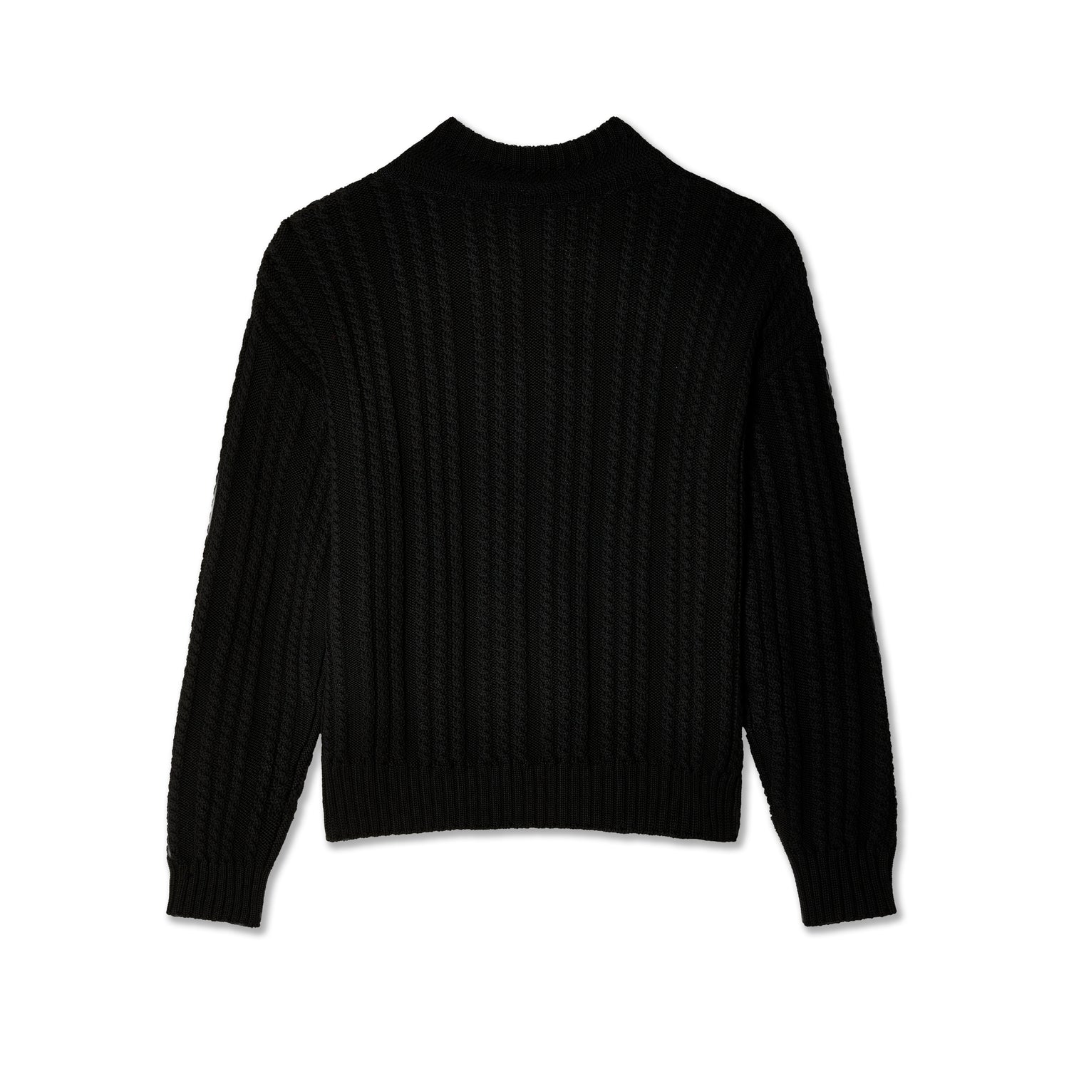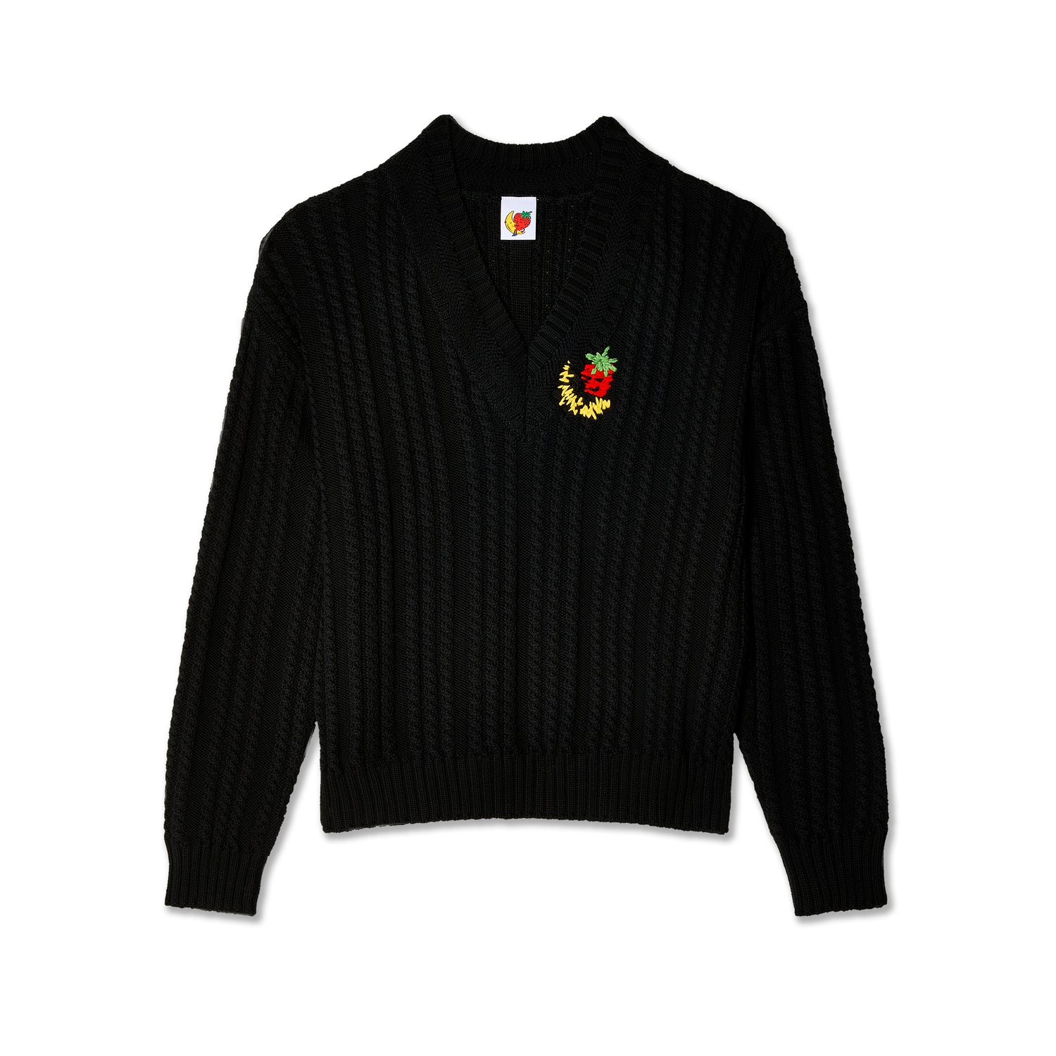 Made in Italy, our cable knit sweater has a boxy fit intended to fall just below the hip. Featuring a v-neck with glow-in-the-dark pastel colored stripes and a knitted abstract take on our classic Strawberry + Moon logo.