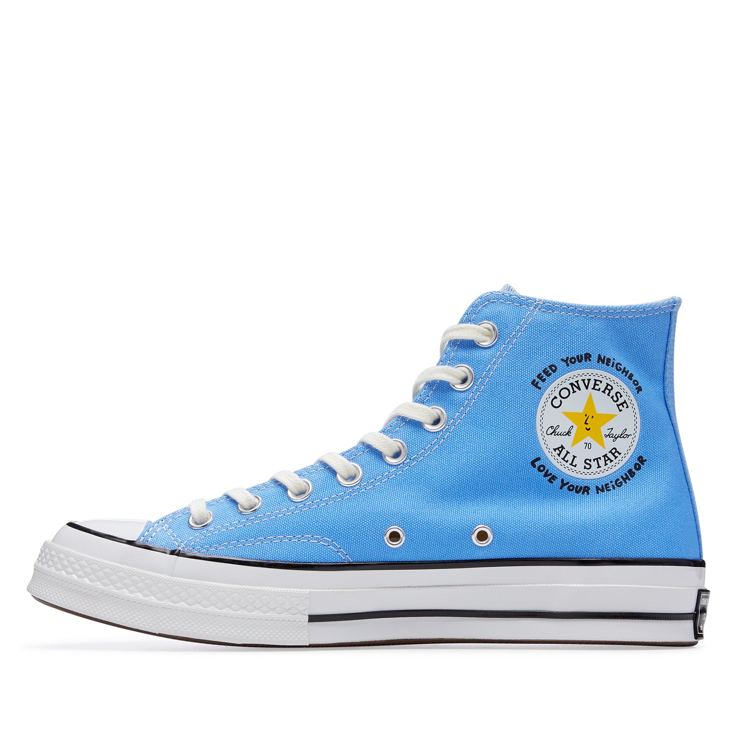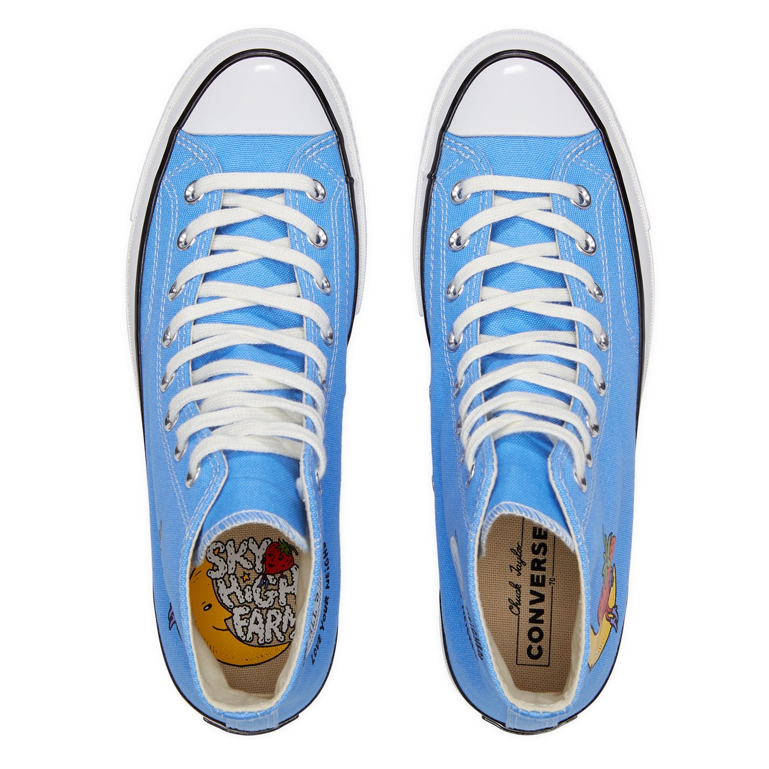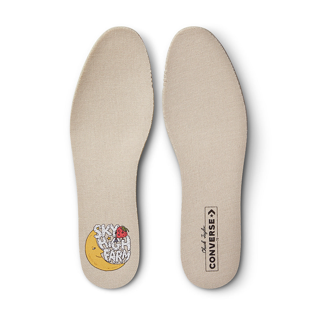 The Converse x Sky High Farm Workwear Chuck 70 is subtle and classic, incorporating the brand’s own Strawberry-Moon logo on a black canvas silhouette, along with a custom branded star patch framed by our ethos: ‘FEED YOUR NEIGHBOR, LOVE YOUR NEIGHBOR.’ Each pair comes with a co-branded sockliner and an extra set of star-printed laces that match a custom star motif, found on the left shoe's classic Converse license plate.