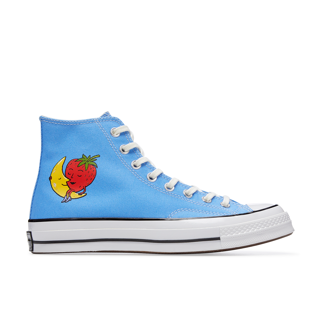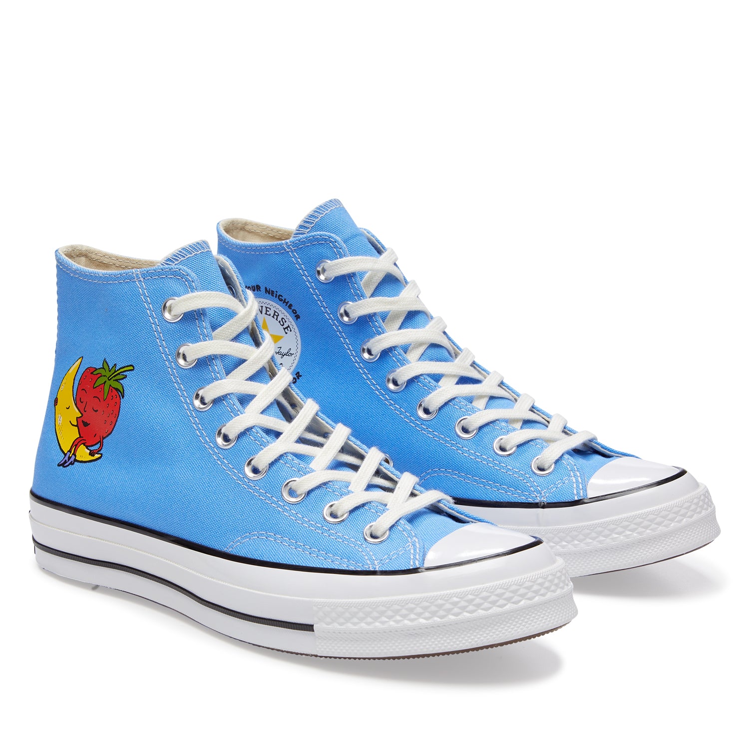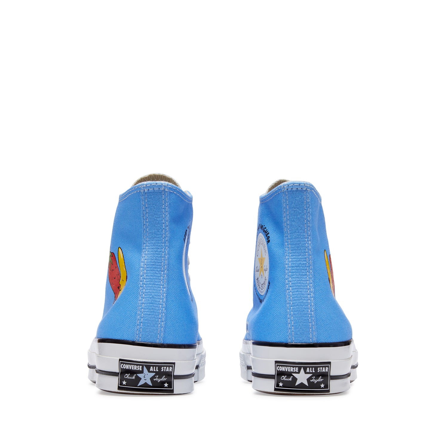 The Converse x Sky High Farm Workwear Chuck 70 is subtle and classic, incorporating the brand’s own Strawberry-Moon logo on a black canvas silhouette, along with a custom branded star patch framed by our ethos: ‘FEED YOUR NEIGHBOR, LOVE YOUR NEIGHBOR.’ Each pair comes with a co-branded sockliner and an extra set of star-printed laces that match a custom star motif, found on the left shoe's classic Converse license plate.
