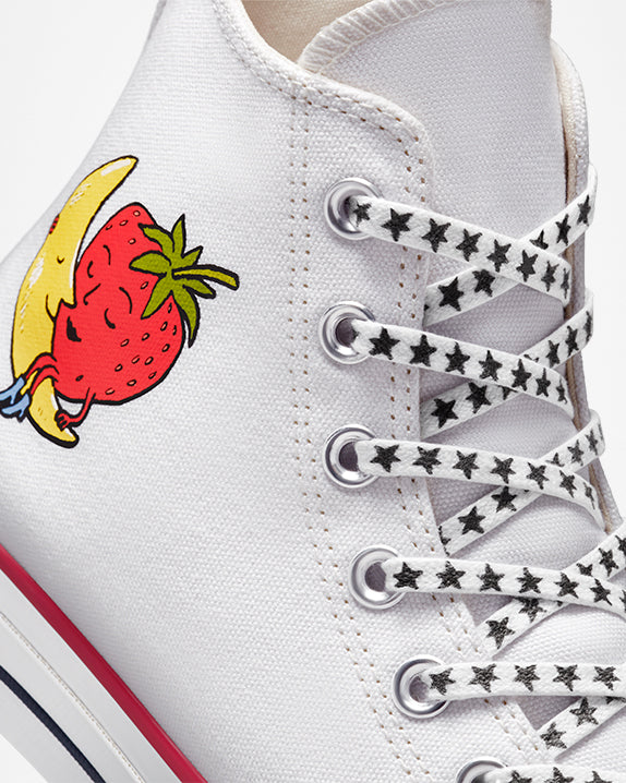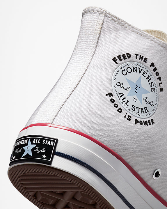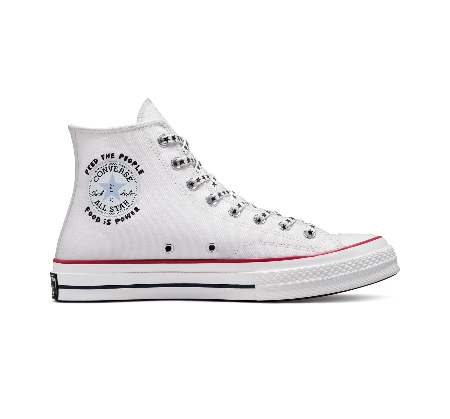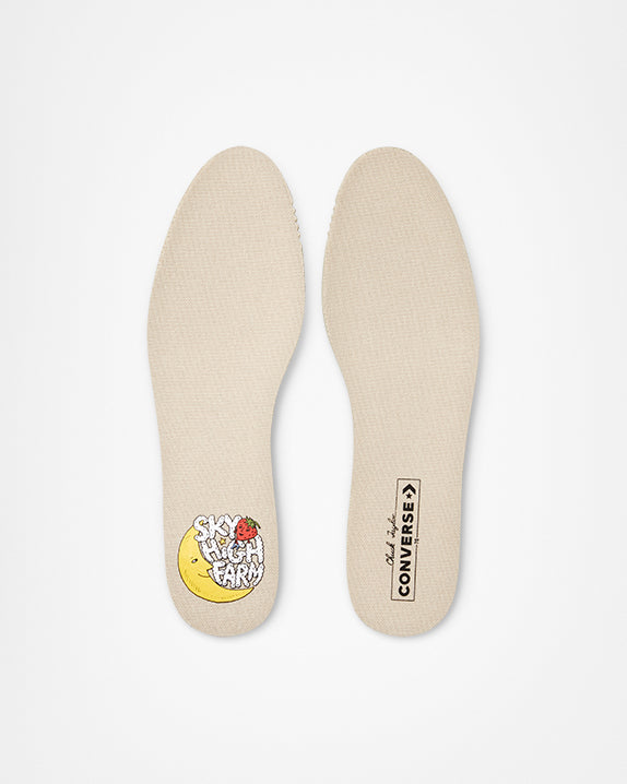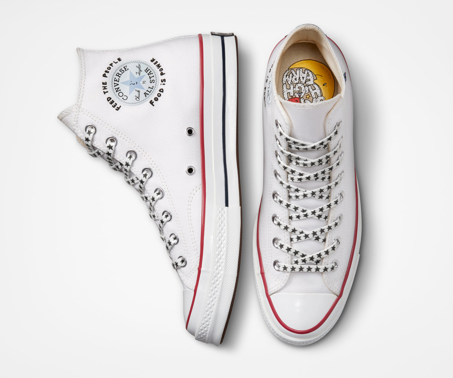 The Converse x Sky High Farm Workwear Chuck 70 is subtle and classic, incorporating the brand’s own Strawberry-Moon logo on a white canvas silhouette, along with a custom branded star patch framed by our ethos: ‘FEED THE PEOPLE. FOOD IS POWER’ Each pair comes with a co-branded sock-liner and a set of black star-printed laces that match a custom star motif, found on the left shoe's classic Converse license plate.