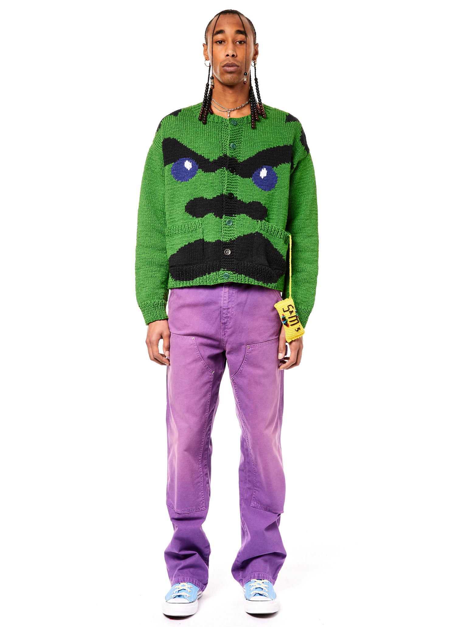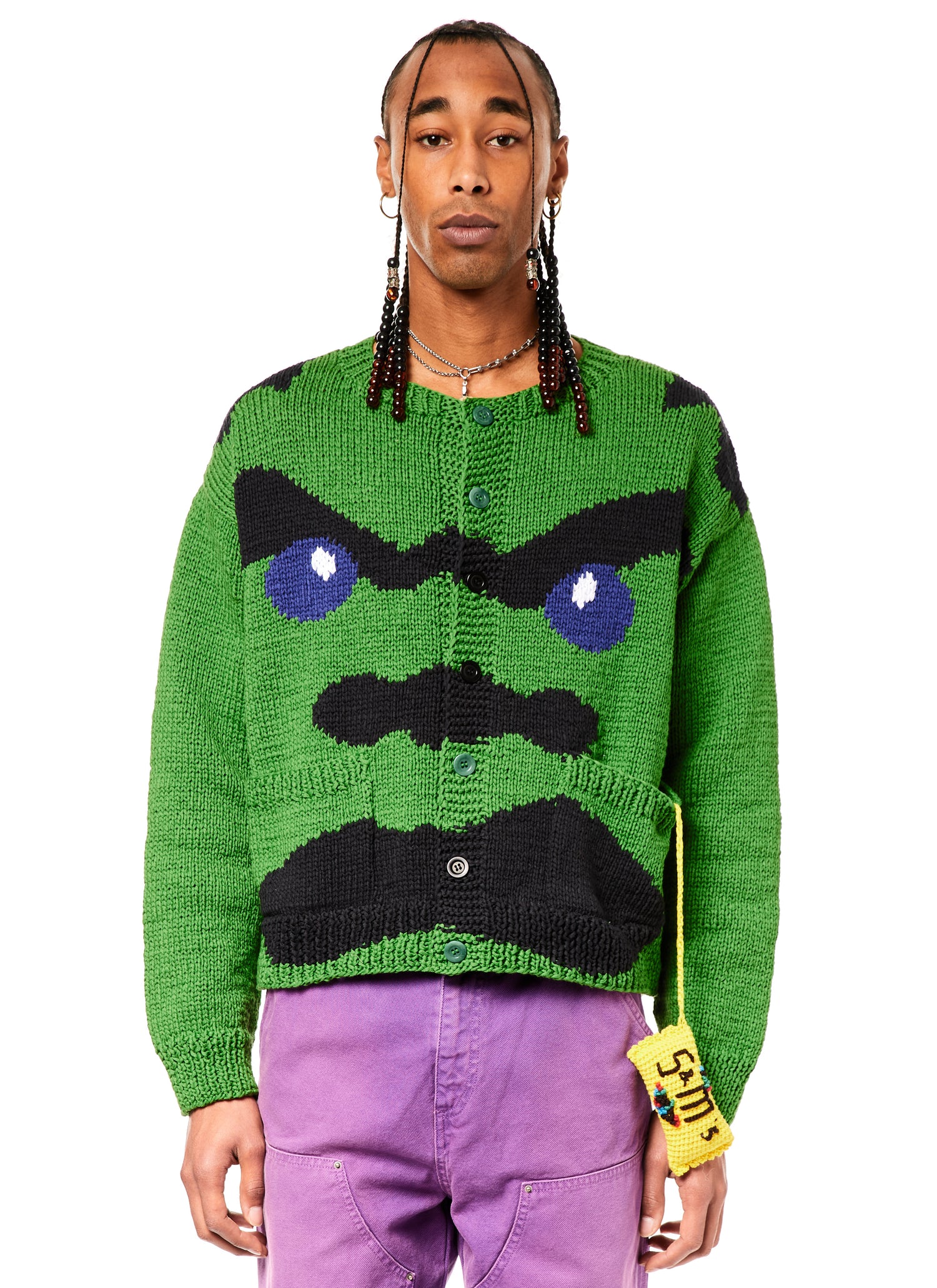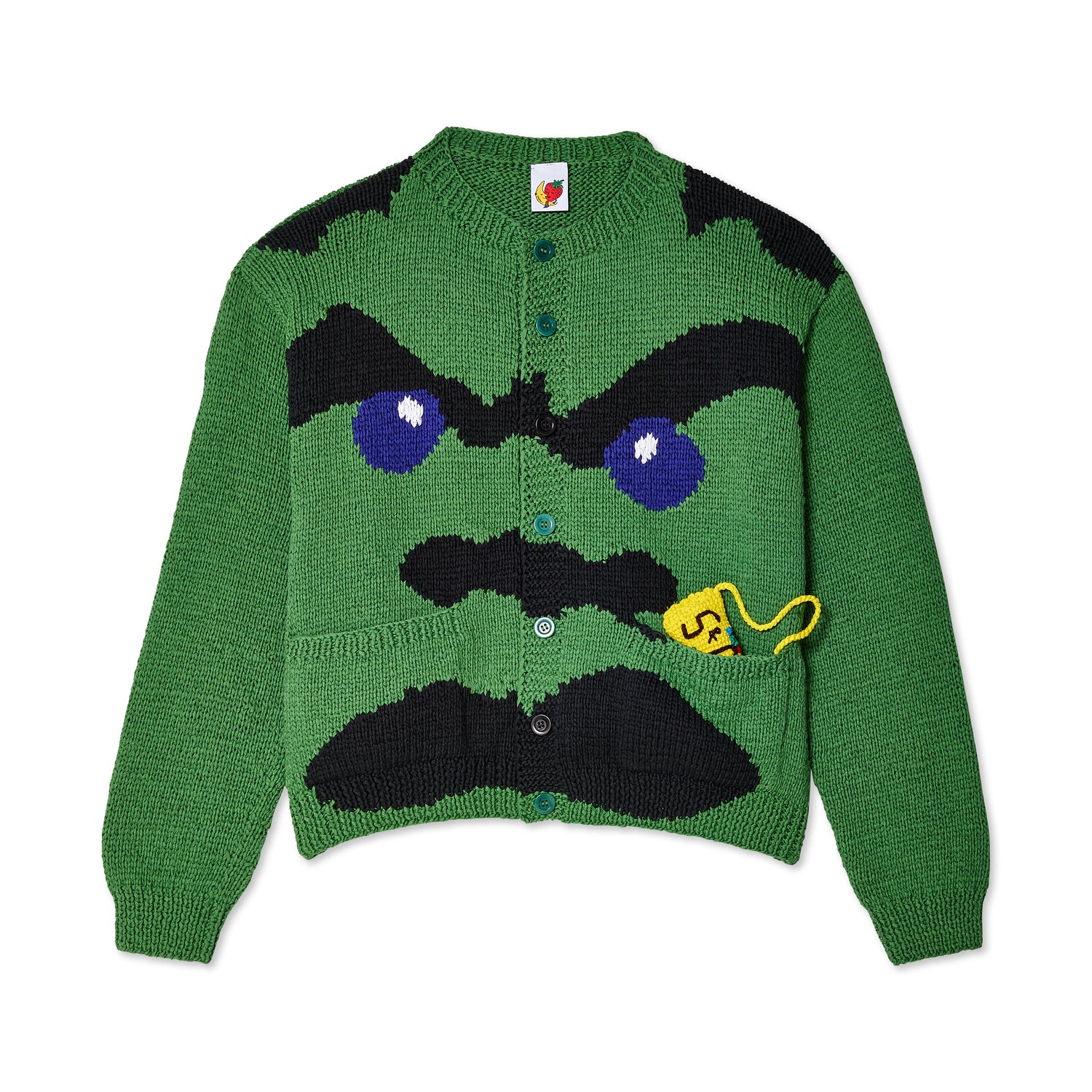 Our signature Stuffie cardigan is hand-knit with thick orgnanic cotton resembling a perfectly imperfect, slightly melted, gumball ice cream bar from your childhood. Featuring a plush Stuffie candy bar that can be hidden in the pocket, with text that nods to your favorite childhood candies.