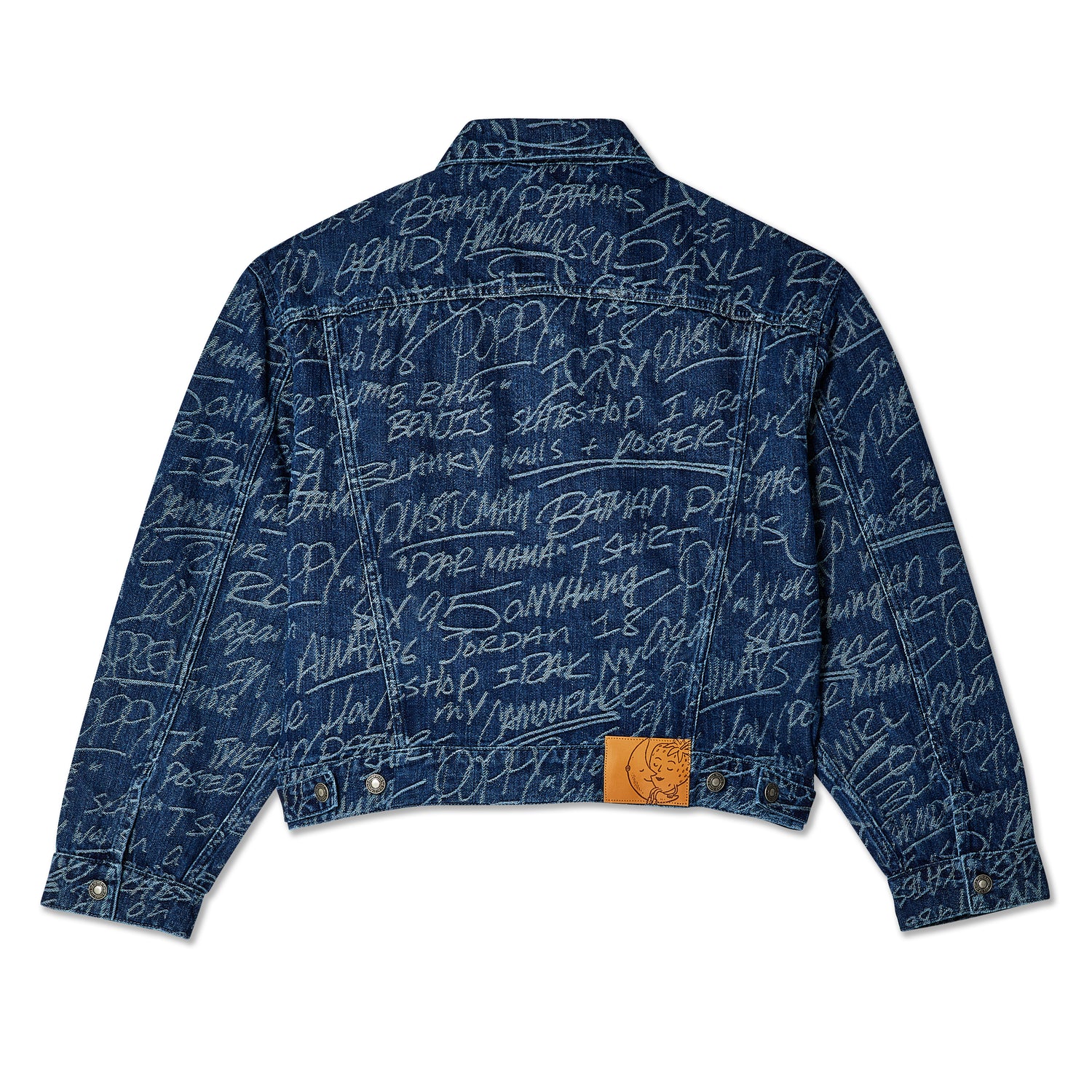 Jacquard-patterned denim with artwork by Ben Solomon, designer and artist from the legendary IRAK crew. The seeminingly random words and phrases are pulled from the biographical survery we asked our friends to fill out to steer the inpsiration for the collection.