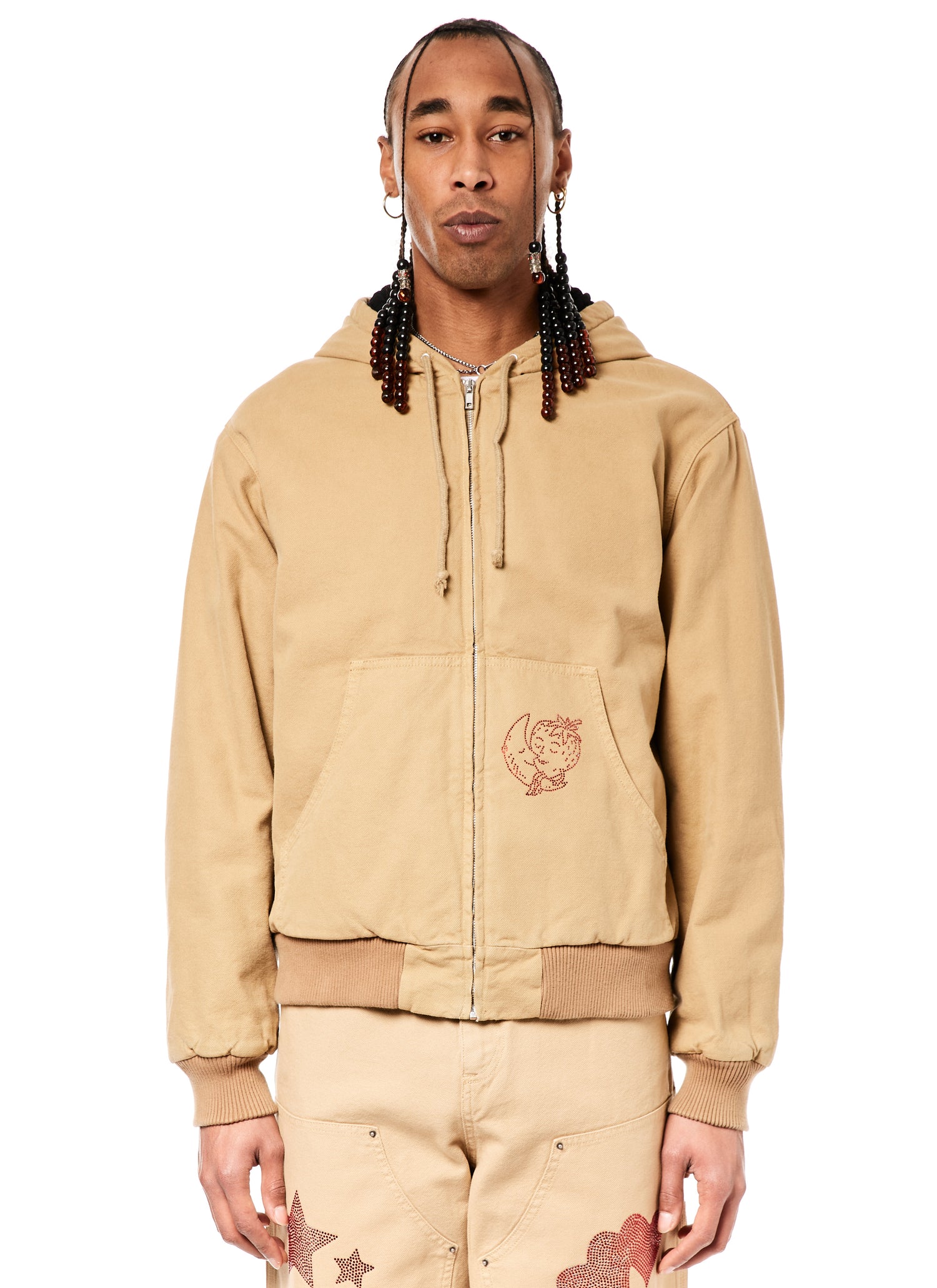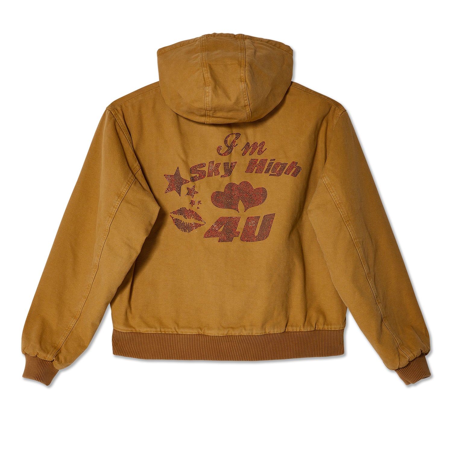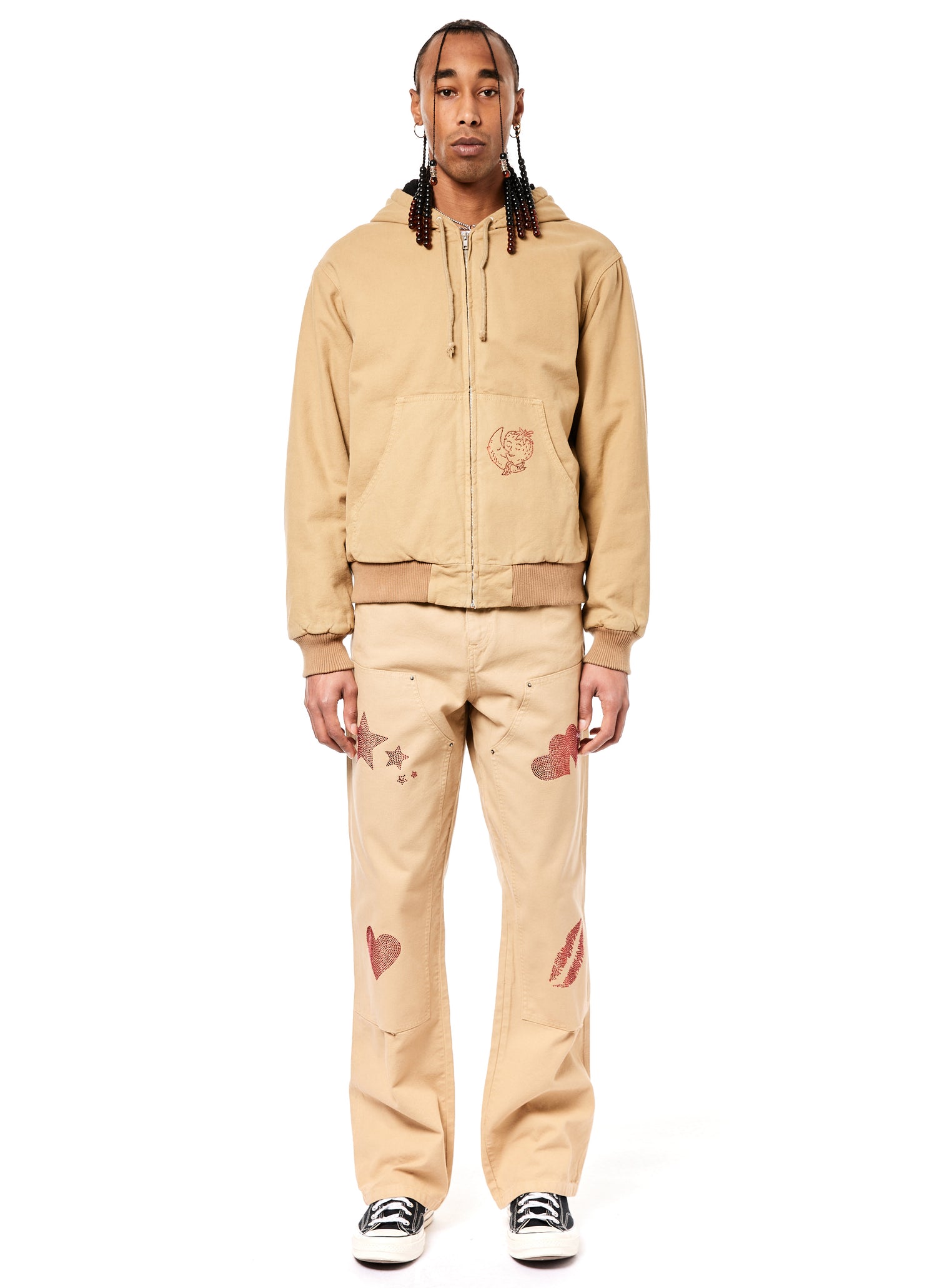 Workwear hoodie constructed out of deadstock tan canvas, the back is adorned with large bedazzled graphics by our FW24 collaborator Vanna Youngstein.