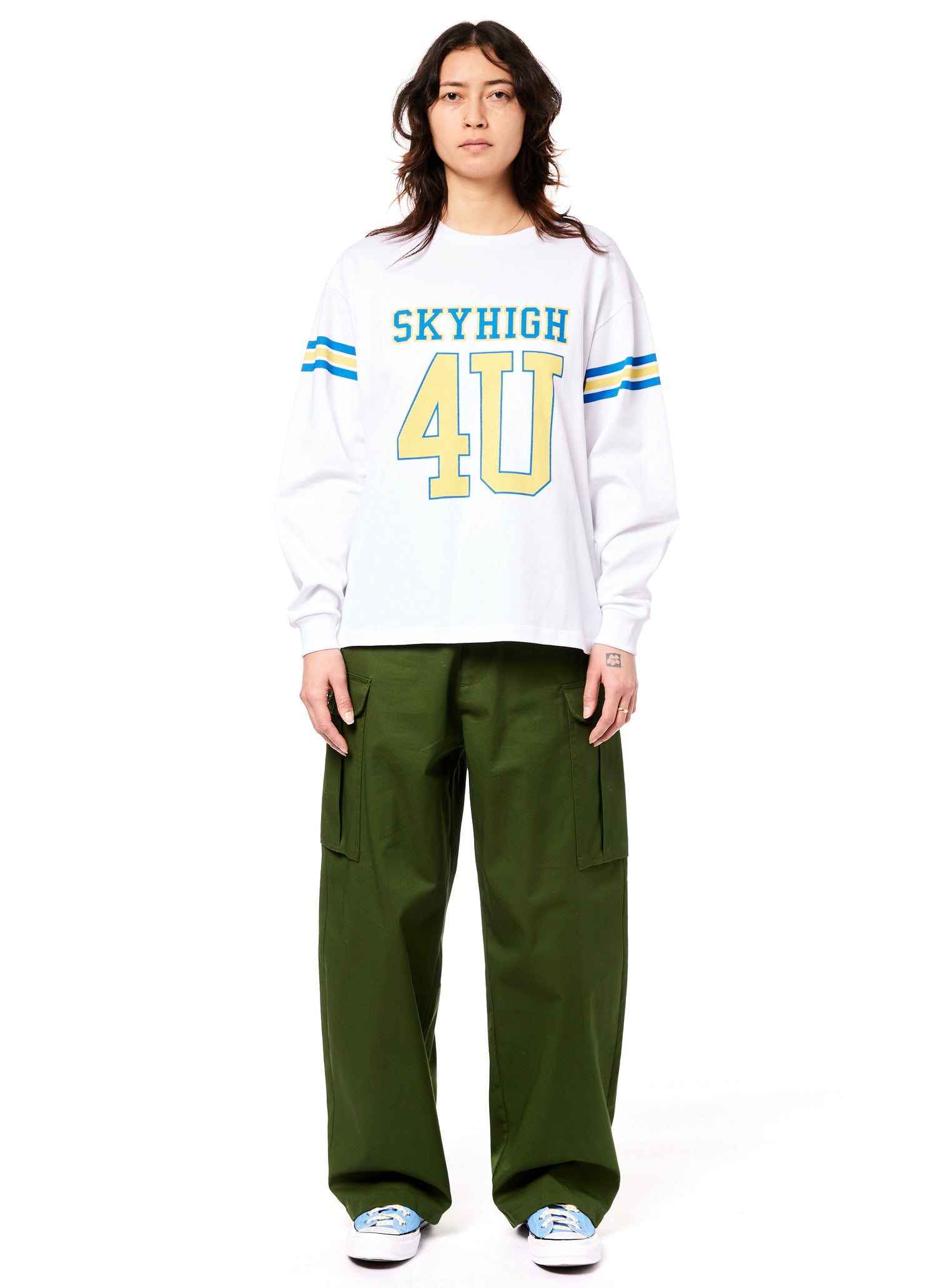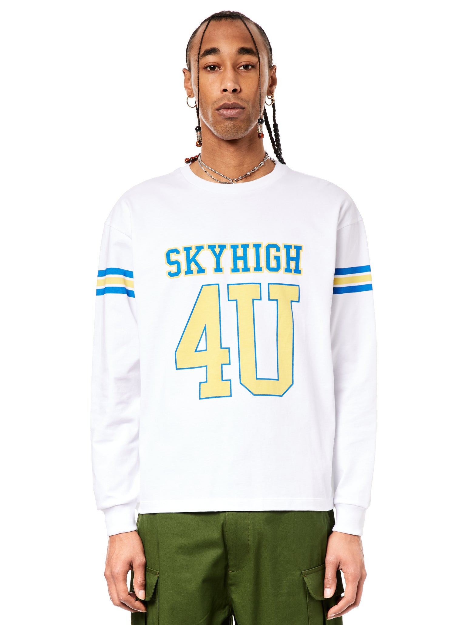 Jersey-style cotton longsleeve features screenprinted "SKYHIGH4U" details on the front and back, complimented by more icon prints on the sleeves.