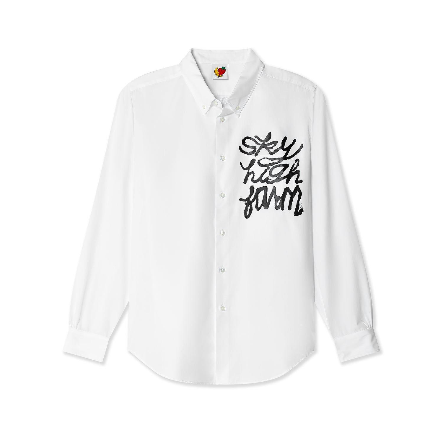 This oversized silhouette features a vibrant Eri Wakiyama handwritten screenprint of our brand name: Sky High Farm across the top left chest.
