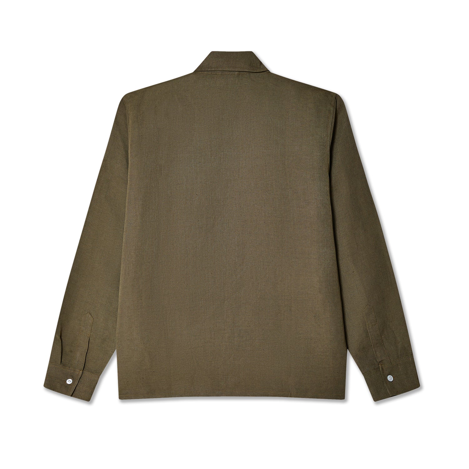 This linen blend shirt is embroidered with SS25's Eri Wakiyama's illustration of a smoking, depressed Strawbabiez that adorns the front body of the garment.