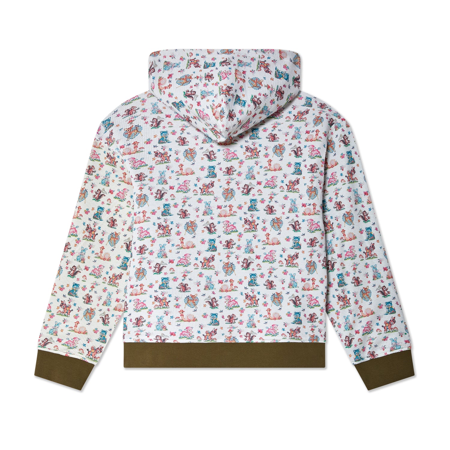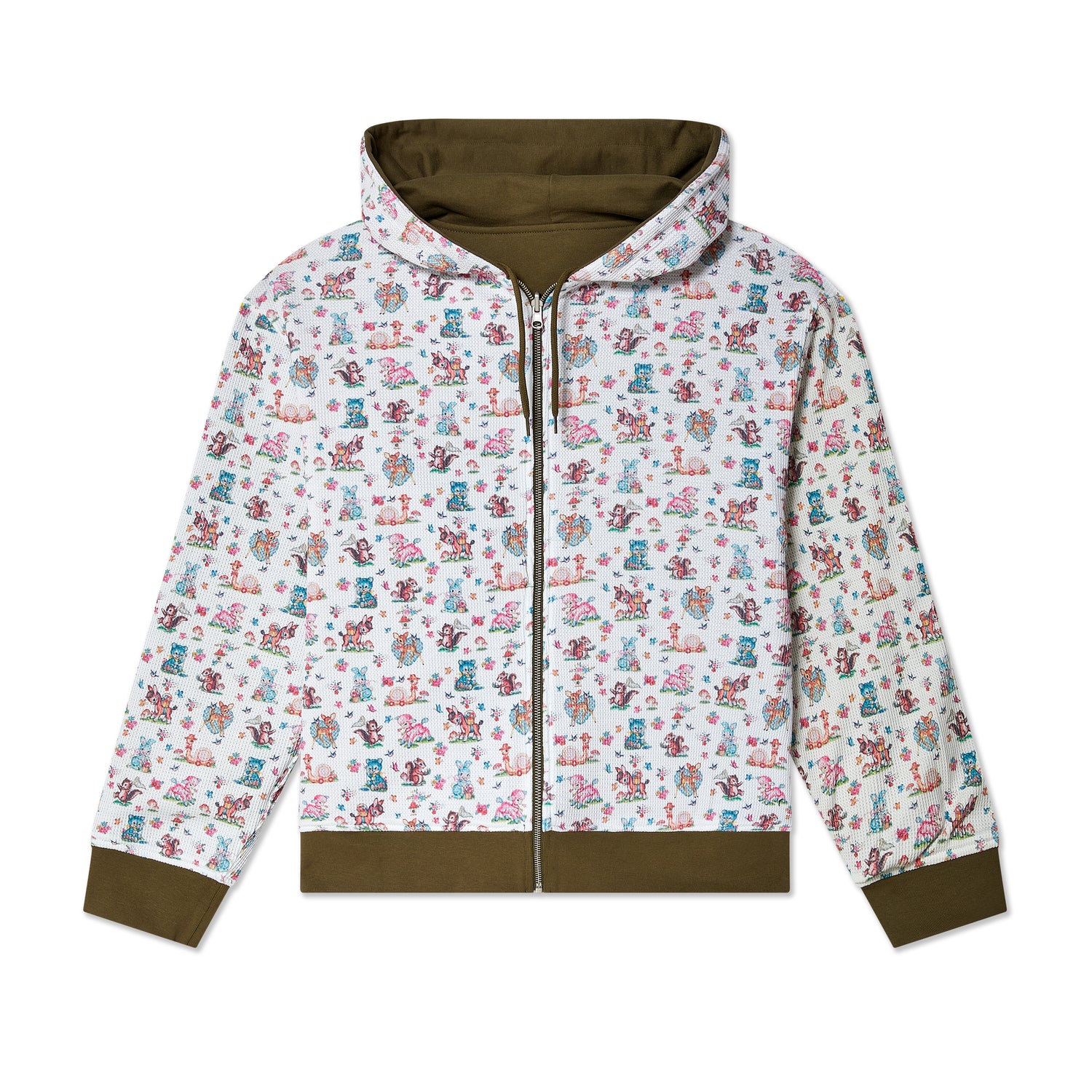 This 100% cotton waffle-knit zip-up hoodie features vibrant Eri Wakiyama characters screen printed throughout. Reversible, featuring plain army green. A cast of characters, this print is a nostalgic pattern of childhood bedsheets.