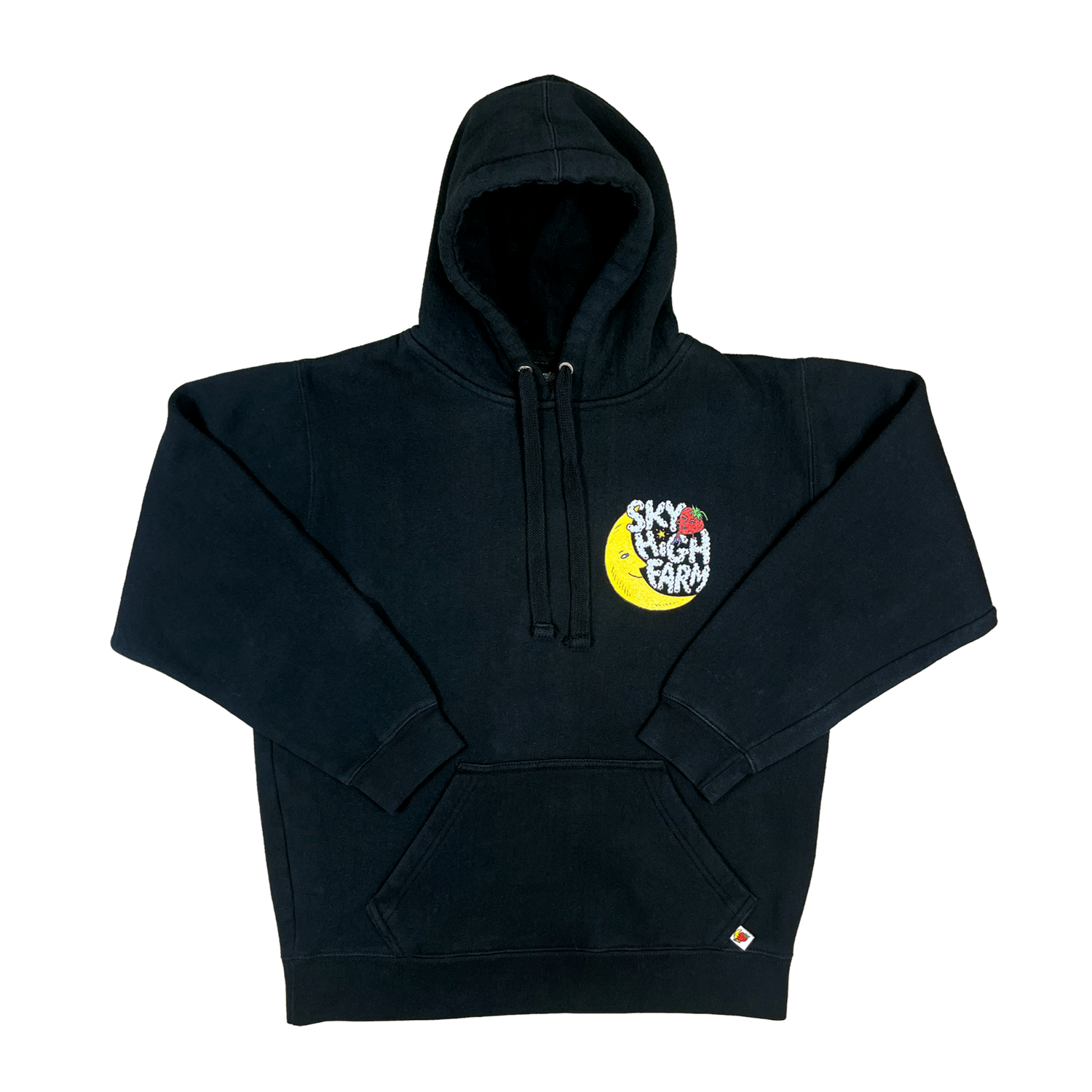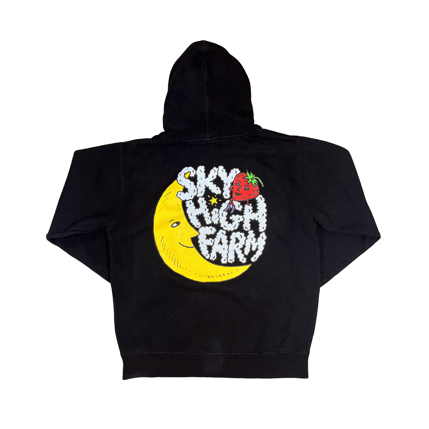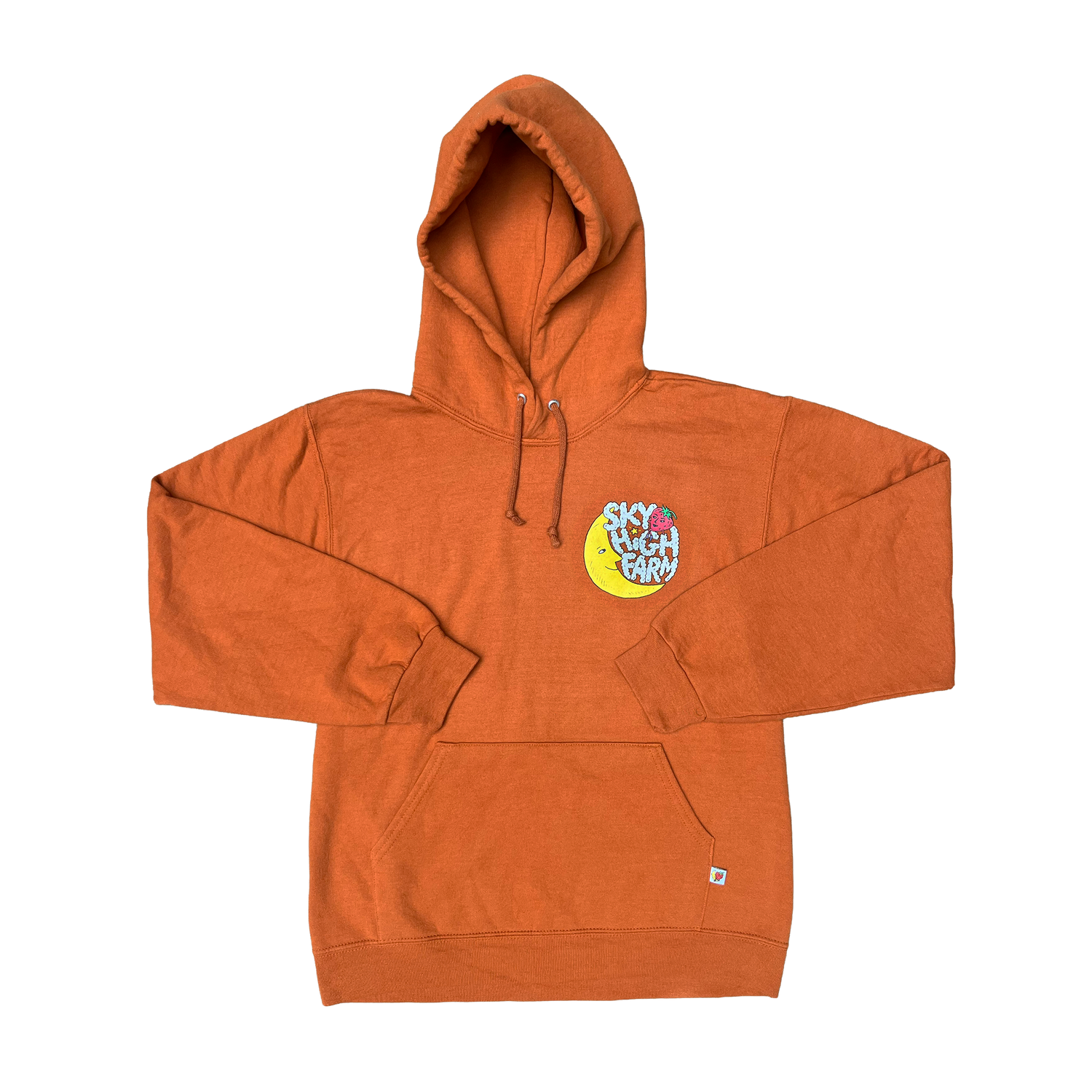 A cotton-poly blend, classic hoodie sourced and screen printed in New York. Sky High Farm Universe logo on the top left chest, across the back the and Sky High Farm Universe Vintage QR code printed on the base of the neck. Scan the QR code on the tag to learn more about the work of Sky High Farm 501(C)3 and its mission to build a more equitable food system.